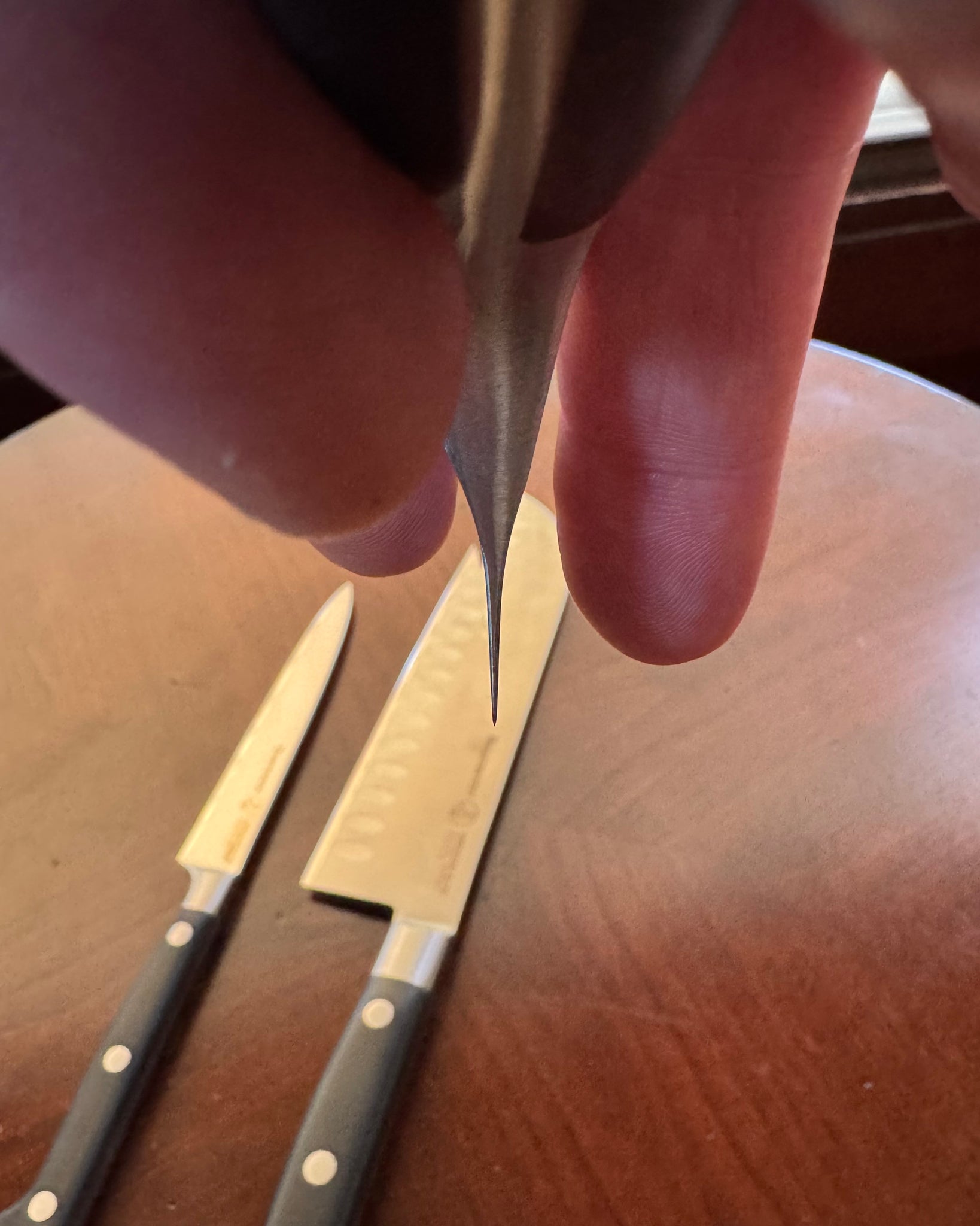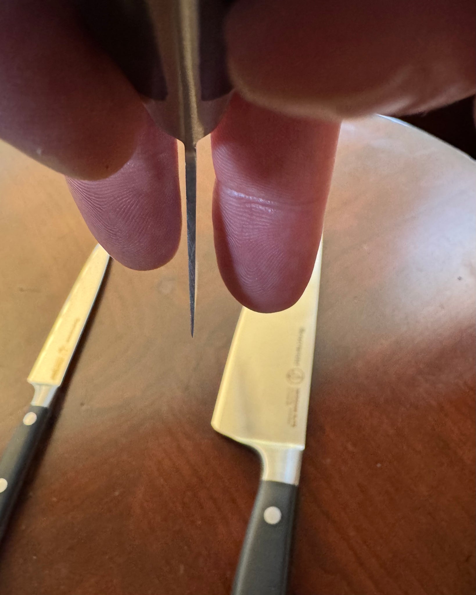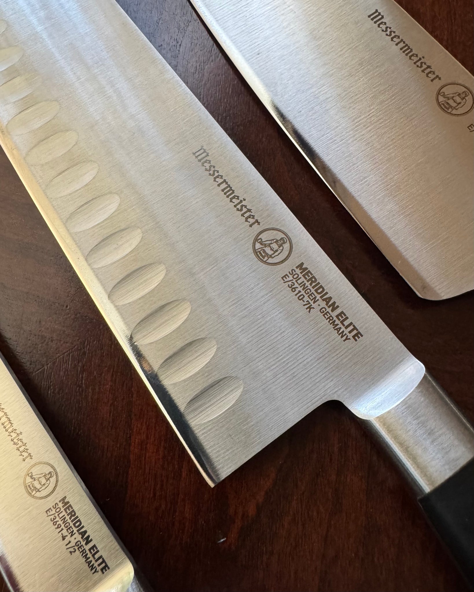 50% off this Messermeister “Meridian Elite” stainless 3 piece set. Includes one 8” “stealth” chef’s knife, one 7” santoku, and one 4.5” paring knife.