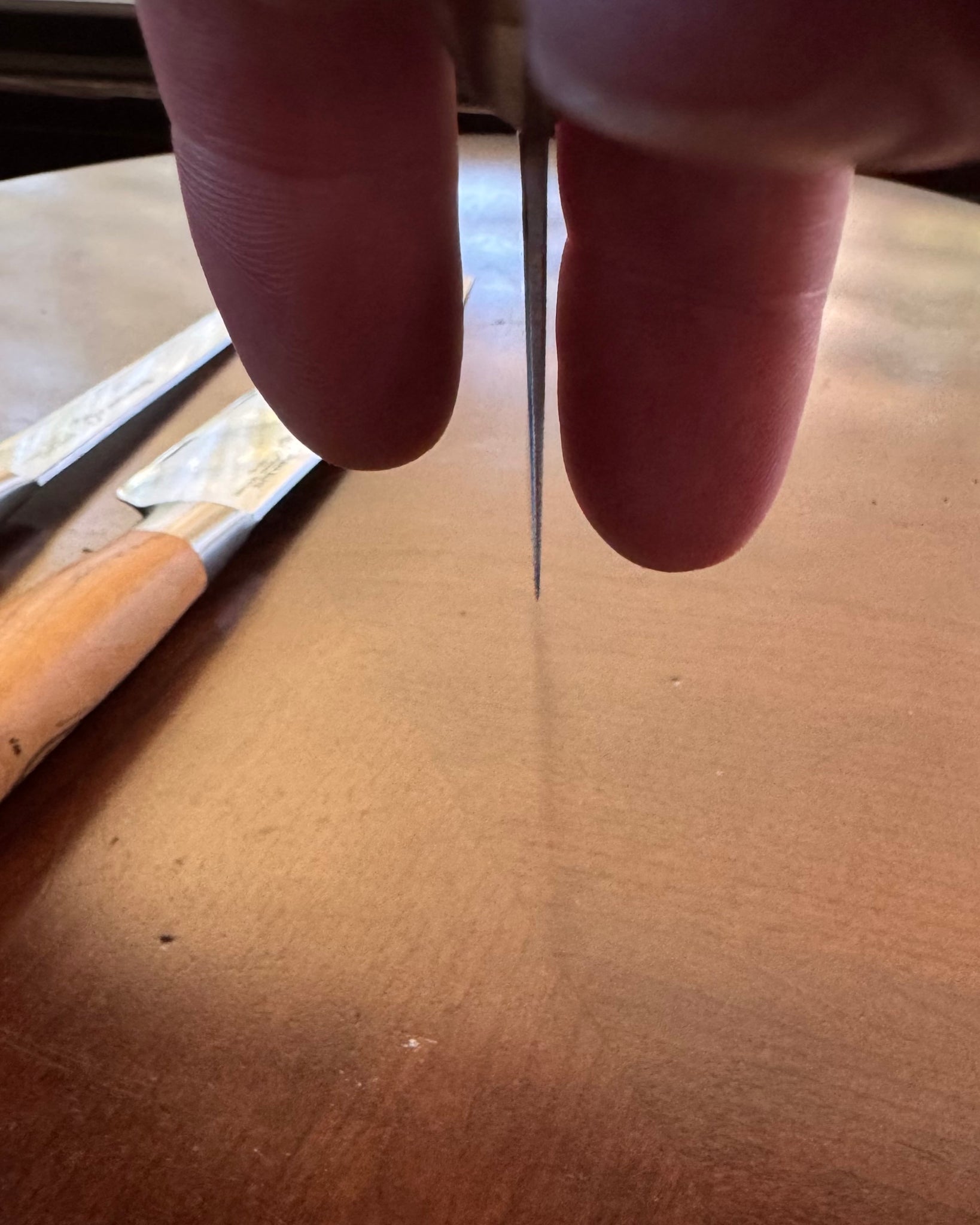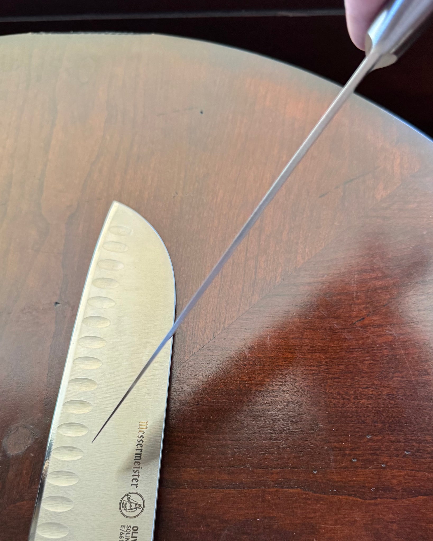 Made in Germany, the Messermeisters are one of my top picks for a German chefs knife. The olive wood handles are EXCEEDINGLY comfortable in the hand, and the knife feels great on the board. Very well balanced. The blades are ground for performance, very thin behind the edge, with an excellent distal taper and sharpened to 15 degrees for great cutting ability. They take an edge quickly and easily. And on top of all that, they have a great, modern looking design that looks beautiful in your kitchen.