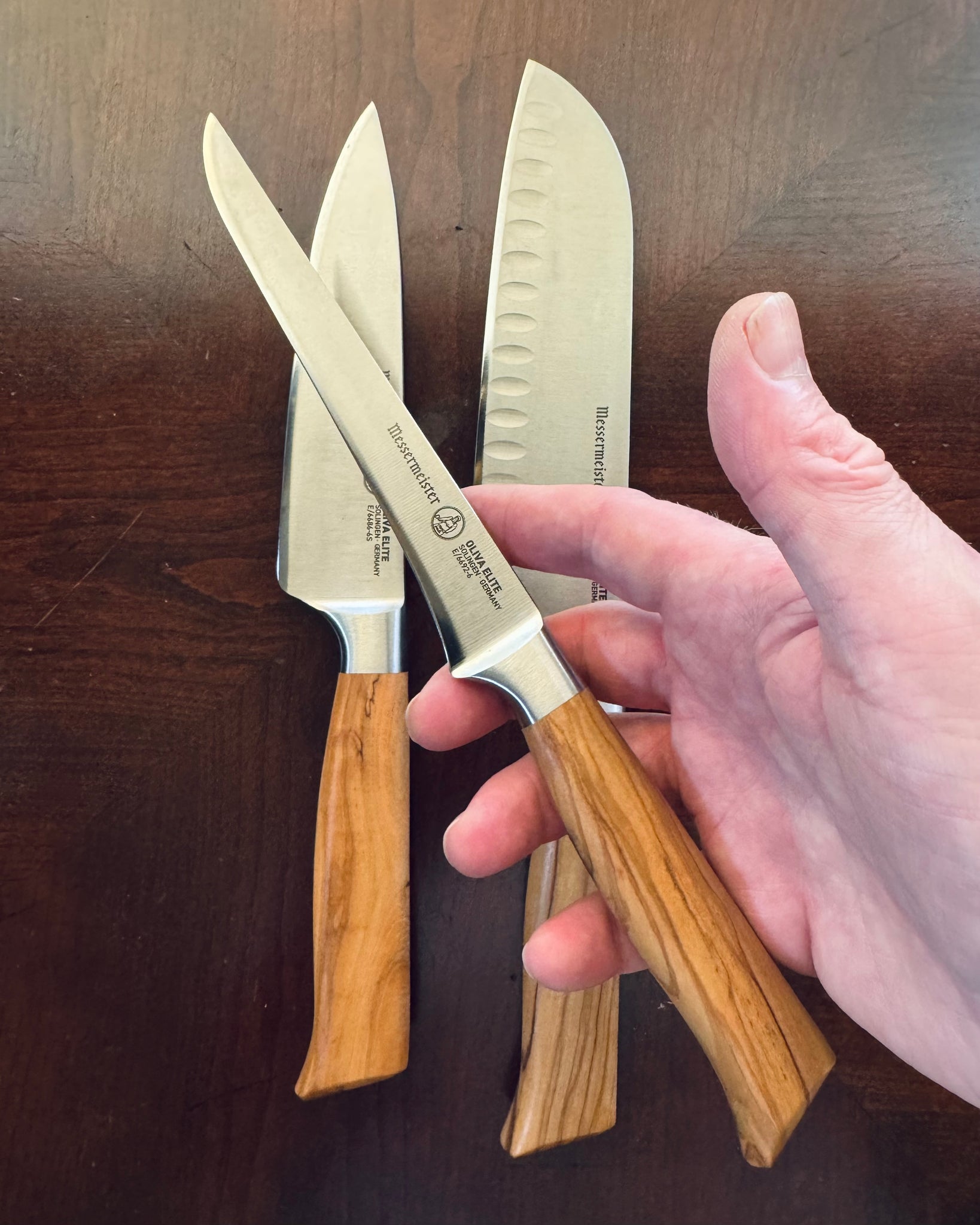 55% off this Messermeister “Oliva Elite” 3 piece set. Includes one 7” santoku, one 6” small chef’s knife, and one 6” boning knife.