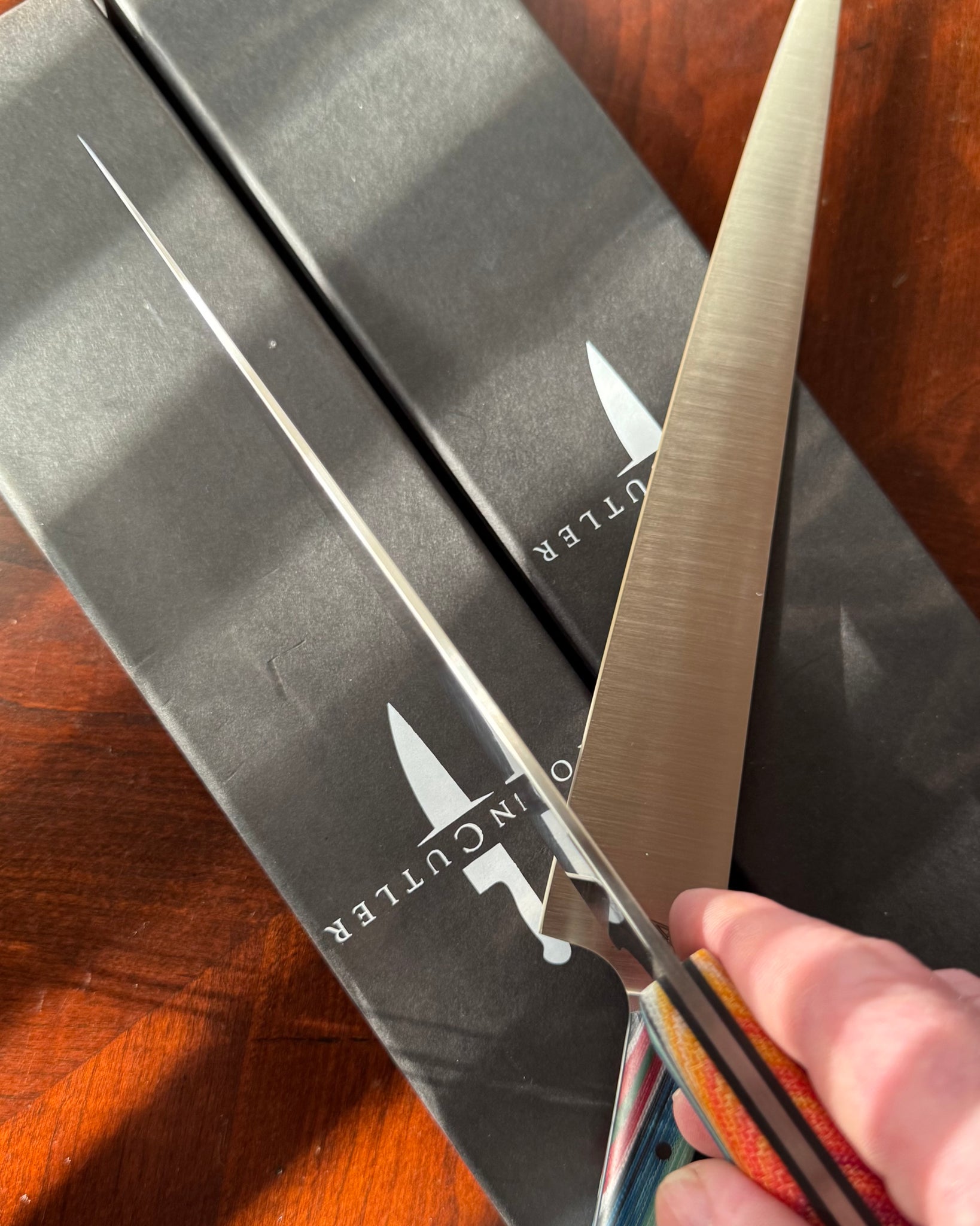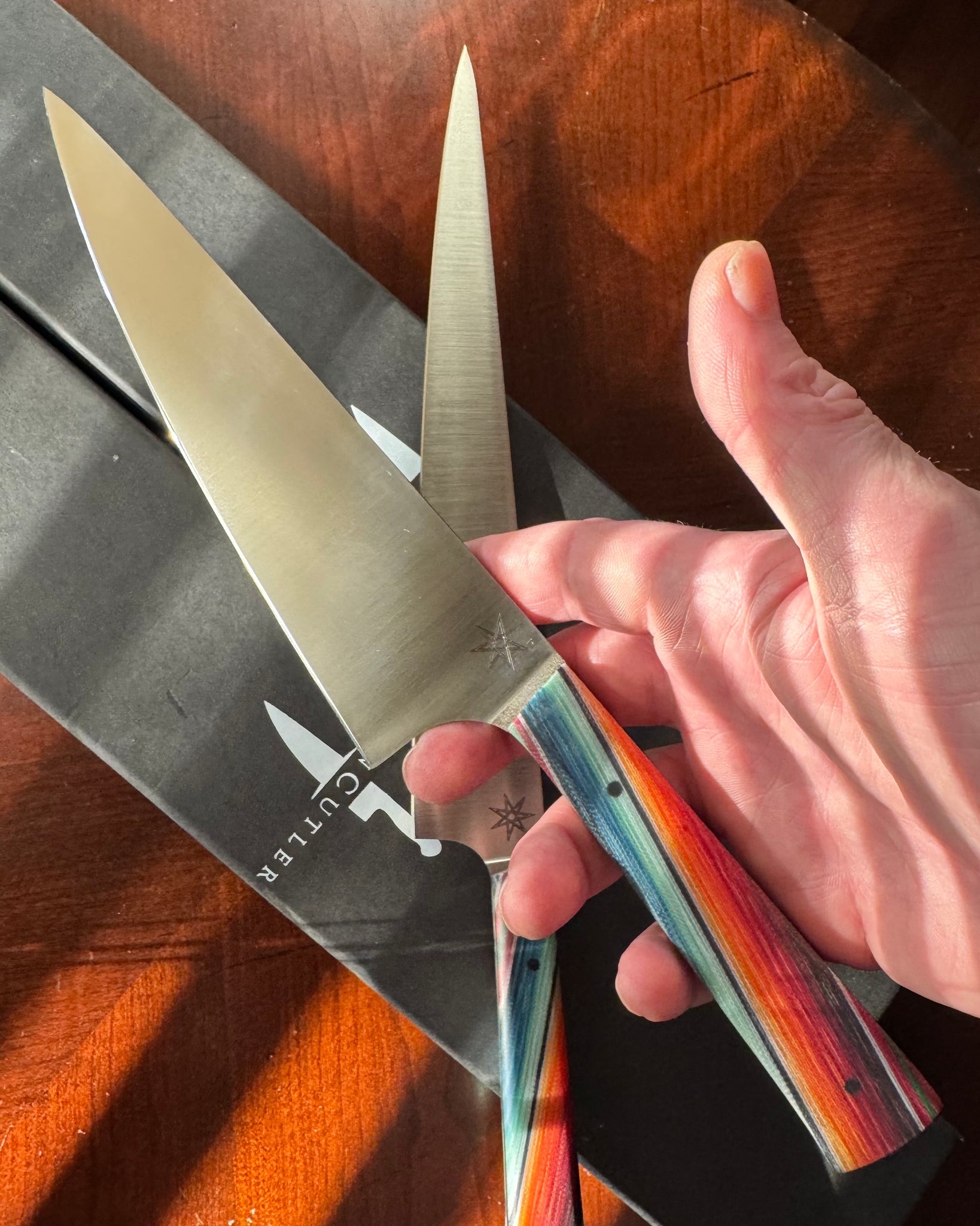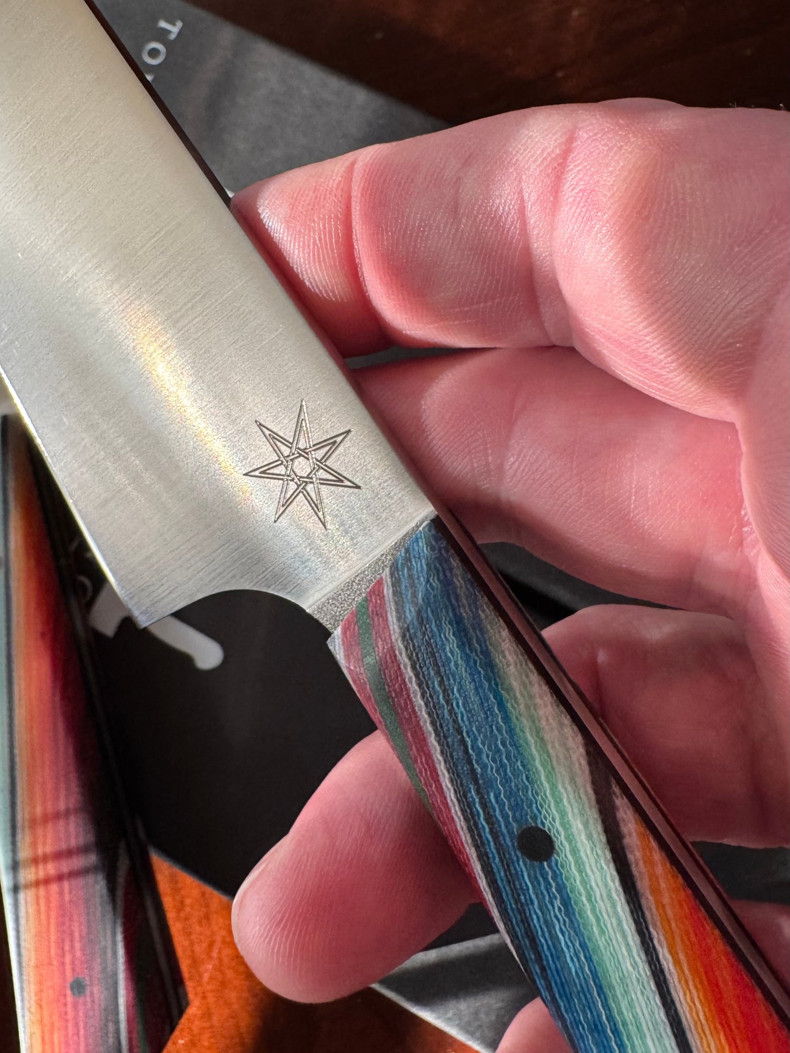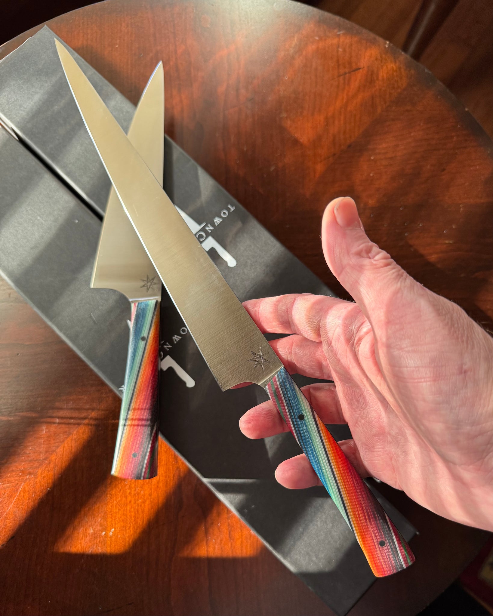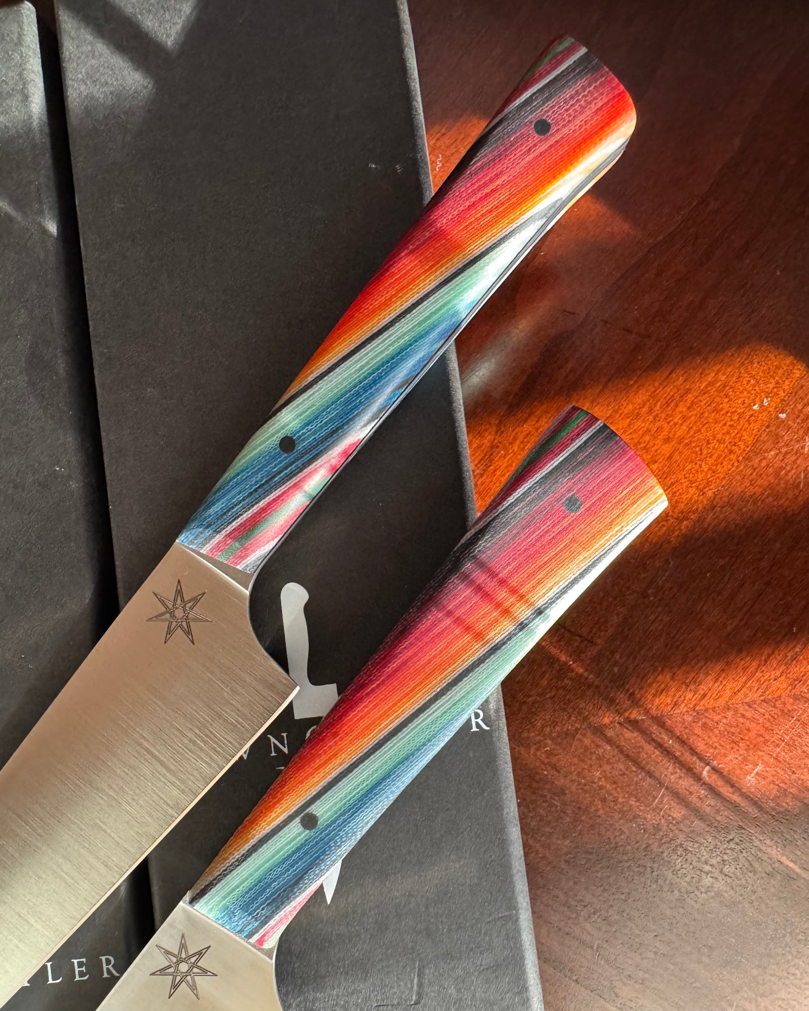 50% off this Town Cutler “Baja” 2 piece set contains one 7” chefs knife and one 10” slicer. Nitro-V stainless steel blade paired with Mexican Blanket Micarta handles.