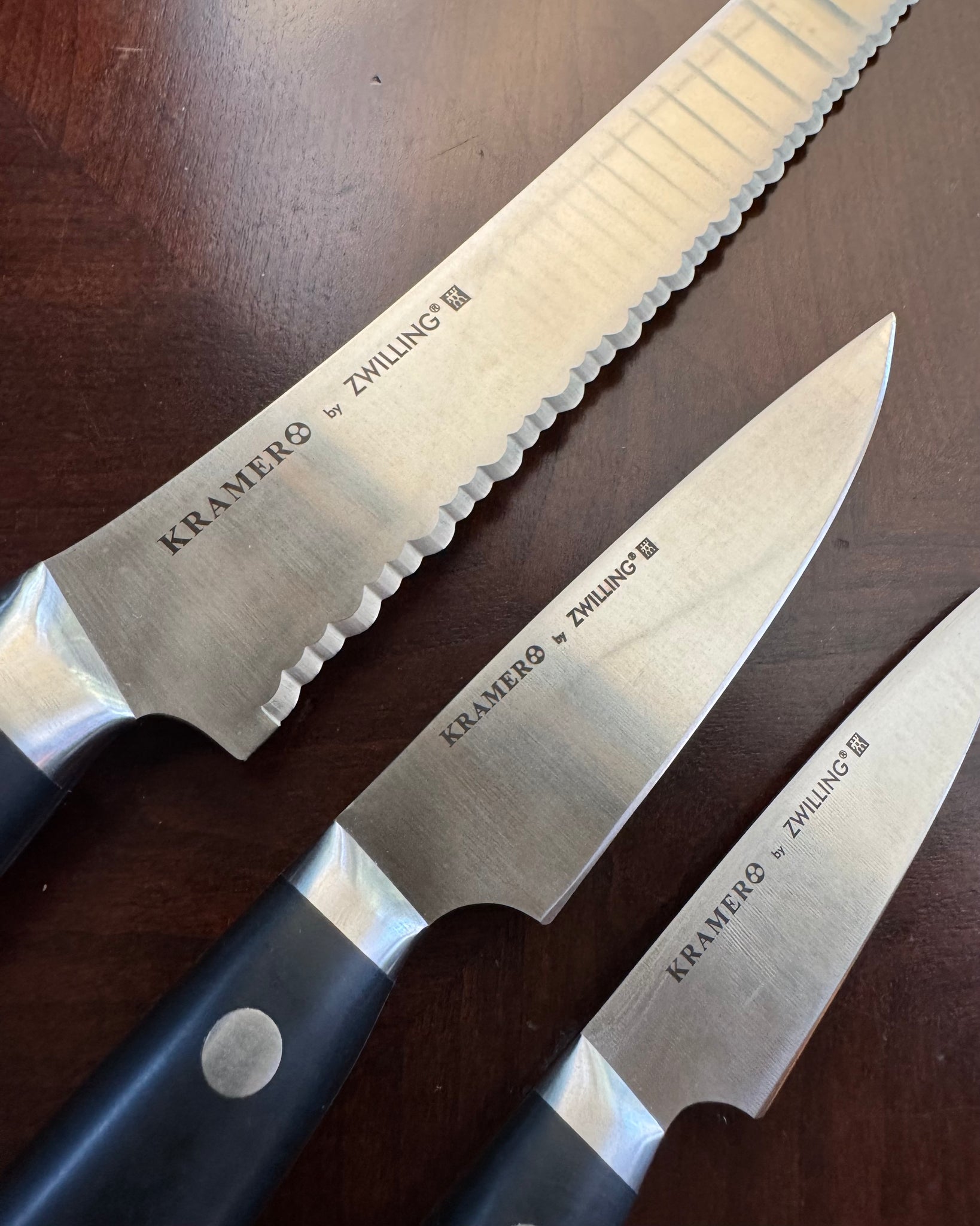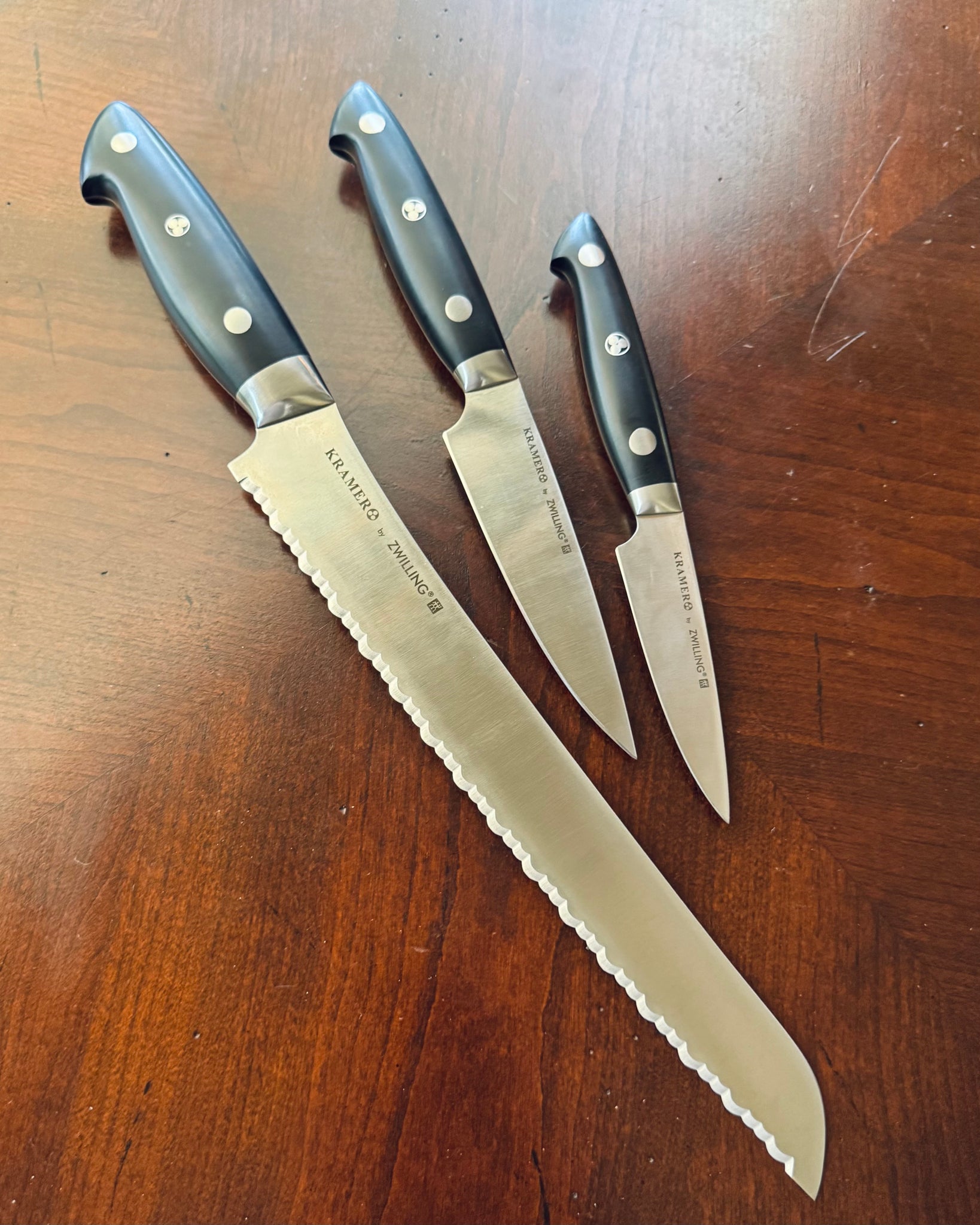 58% off this 3 knife bundle of Kramer by Zwilling “Euroline” knives. Contains one each of 10.25” serrated bread knife, 5” utility knife, and 4” paring knife.