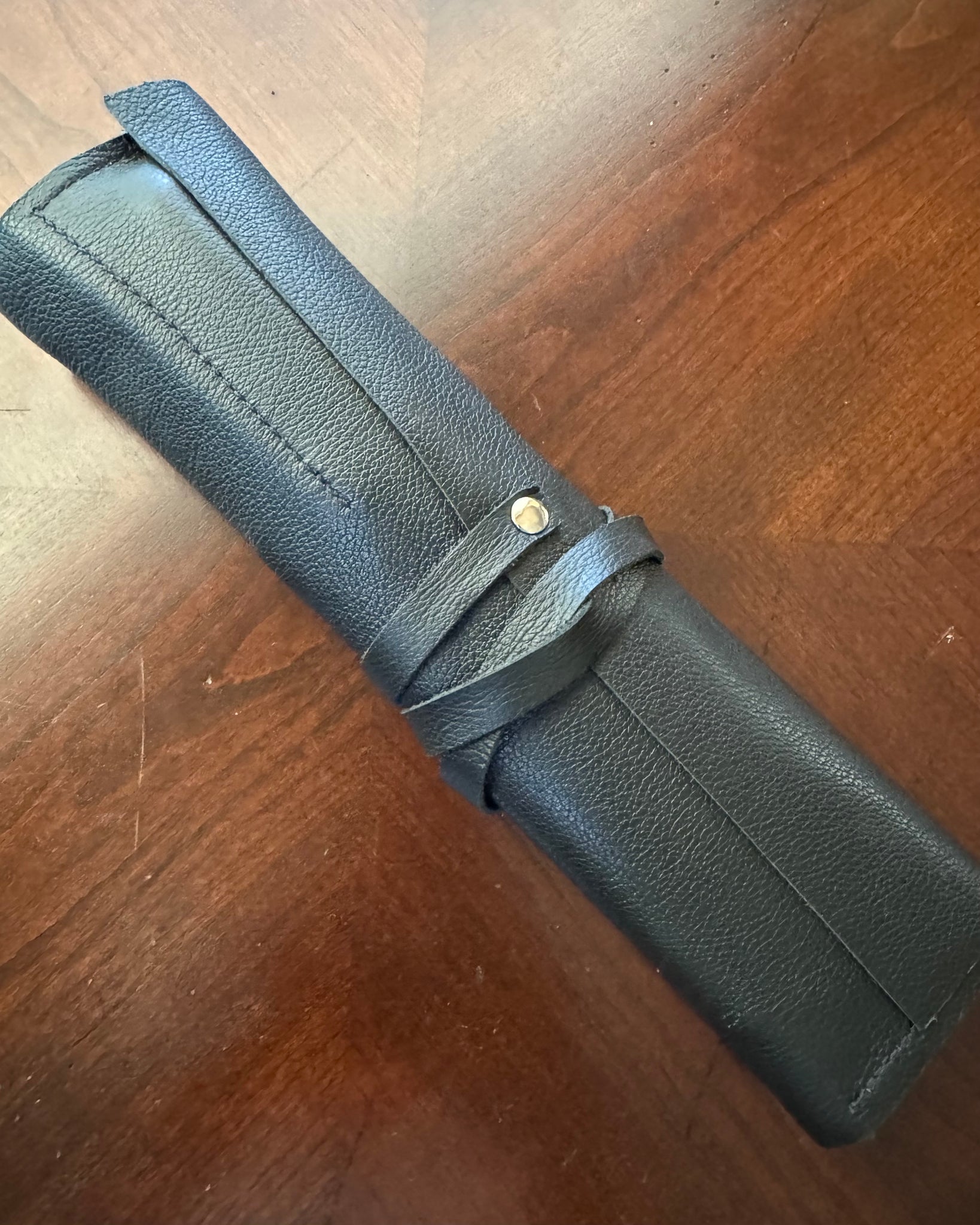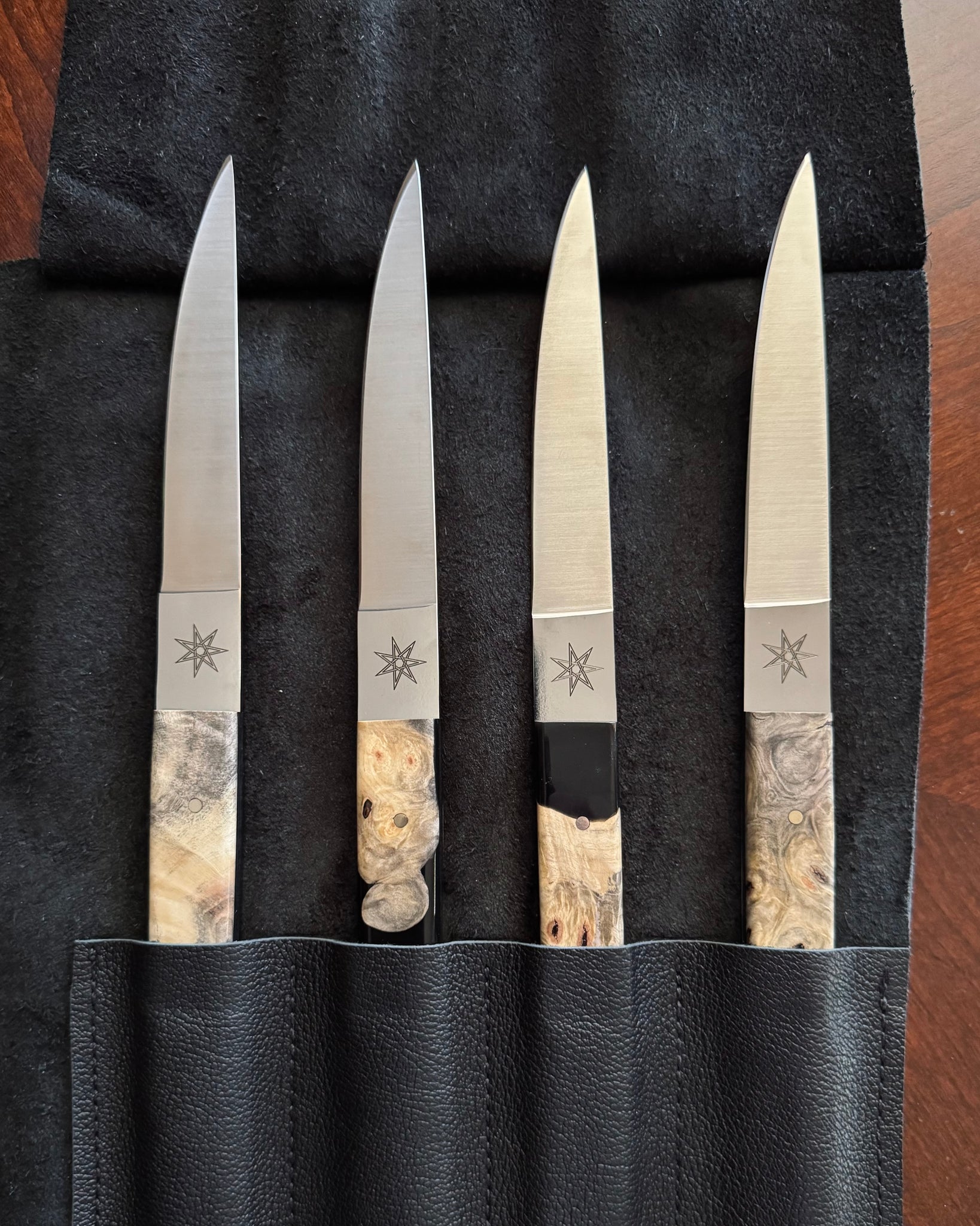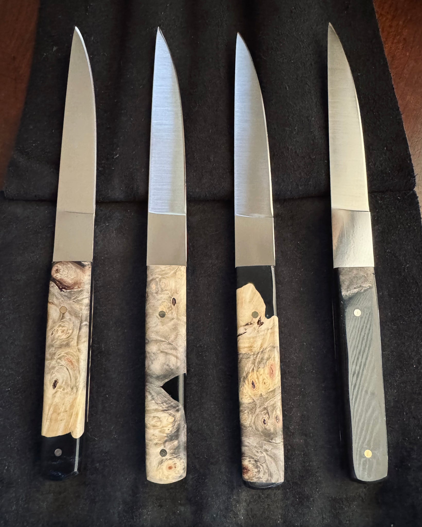 55% off this gorgeous 4 piece set of Town Cutler “Desert Dawn” steak knives. Made out of Nitro-V stainless steel, an extremely well balanced and high performance stainless steel, chosen for its toughness, edge retention, and corrosion resistance, especially formulated for wet environments, so super durable. The handles are live edge buckeye burl and Black “midnight” resin, with nickel silver pins. Knives are 9.25” overall with a 4.5” cutting edge. Comes with black leather knife roll.